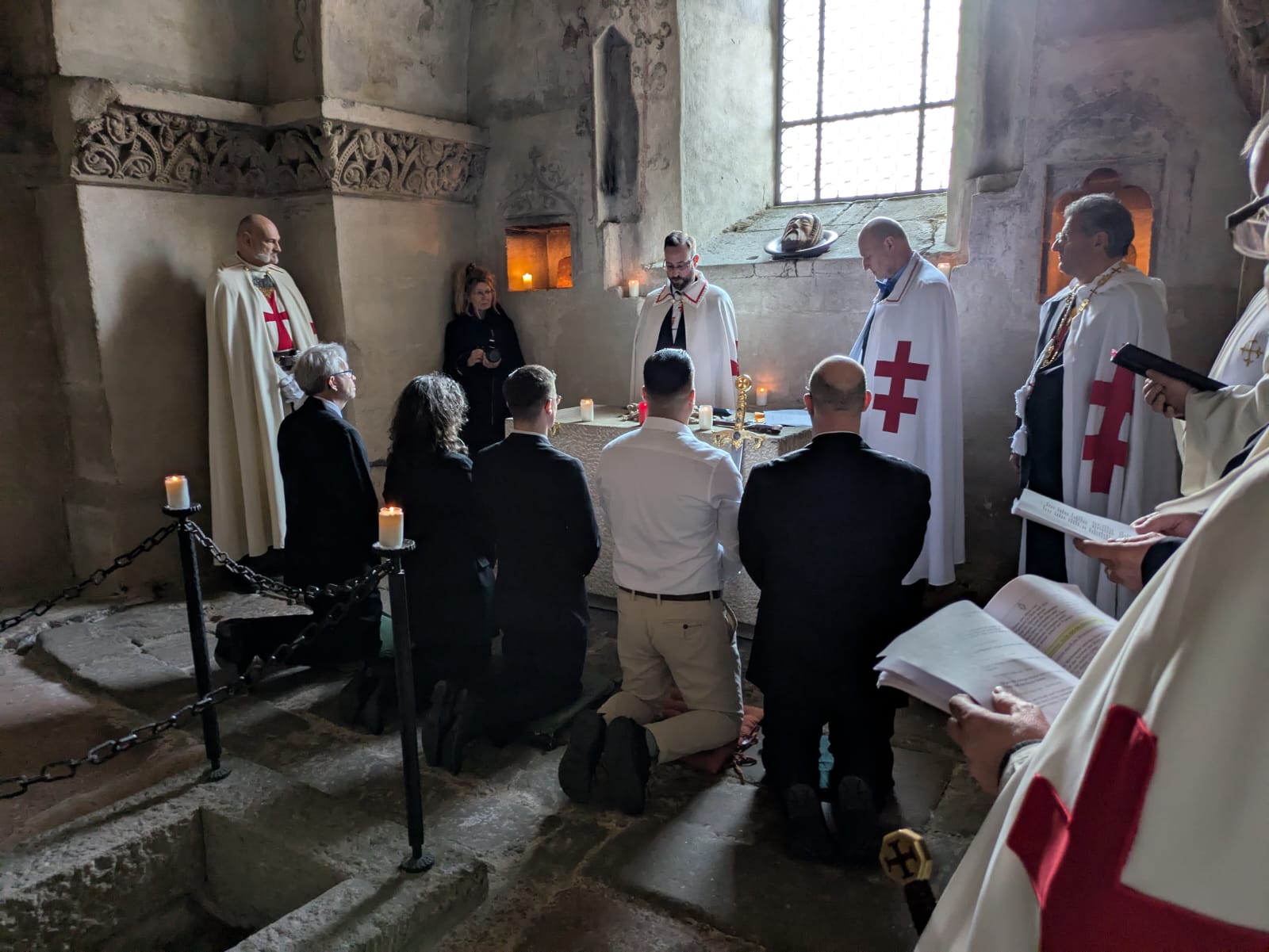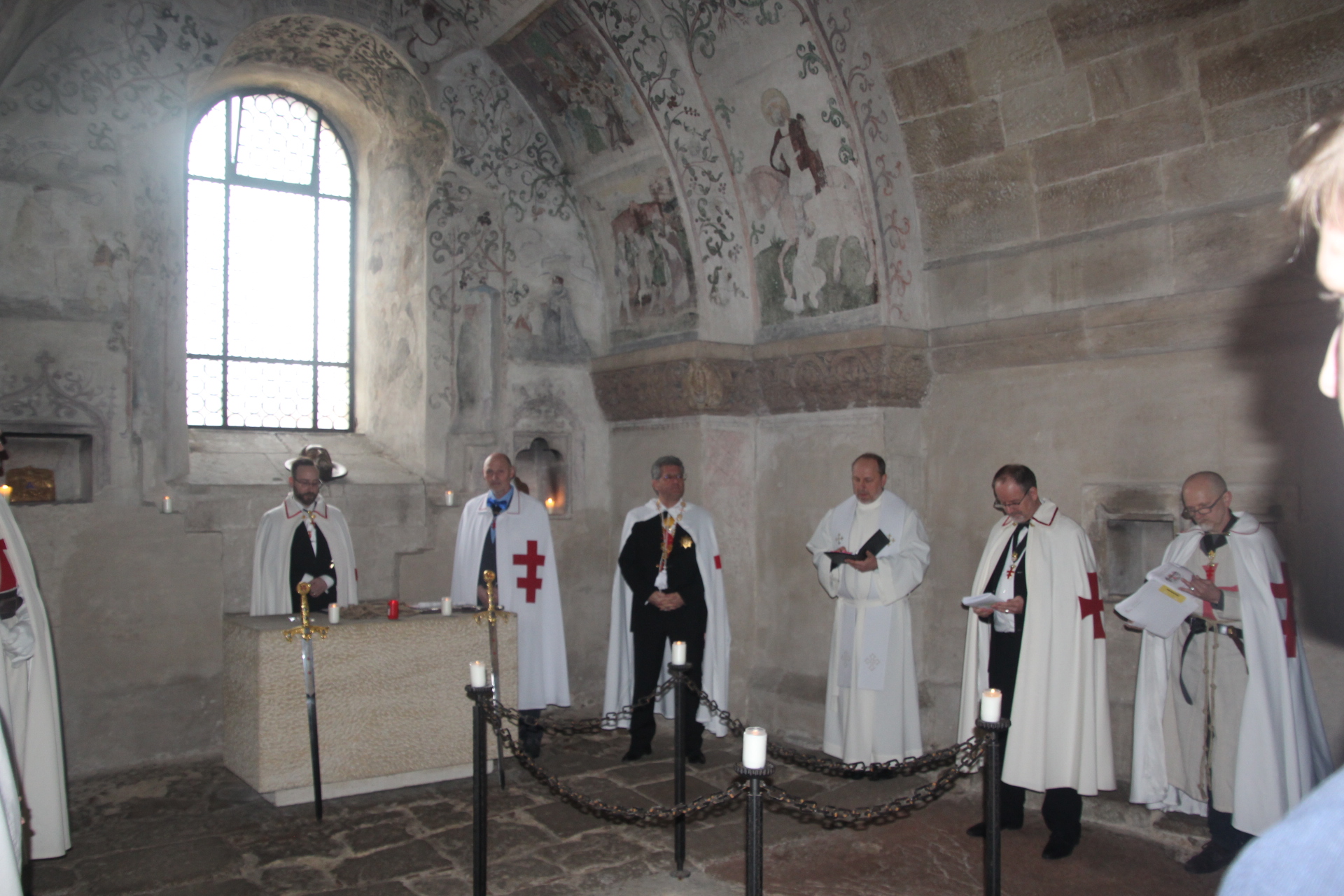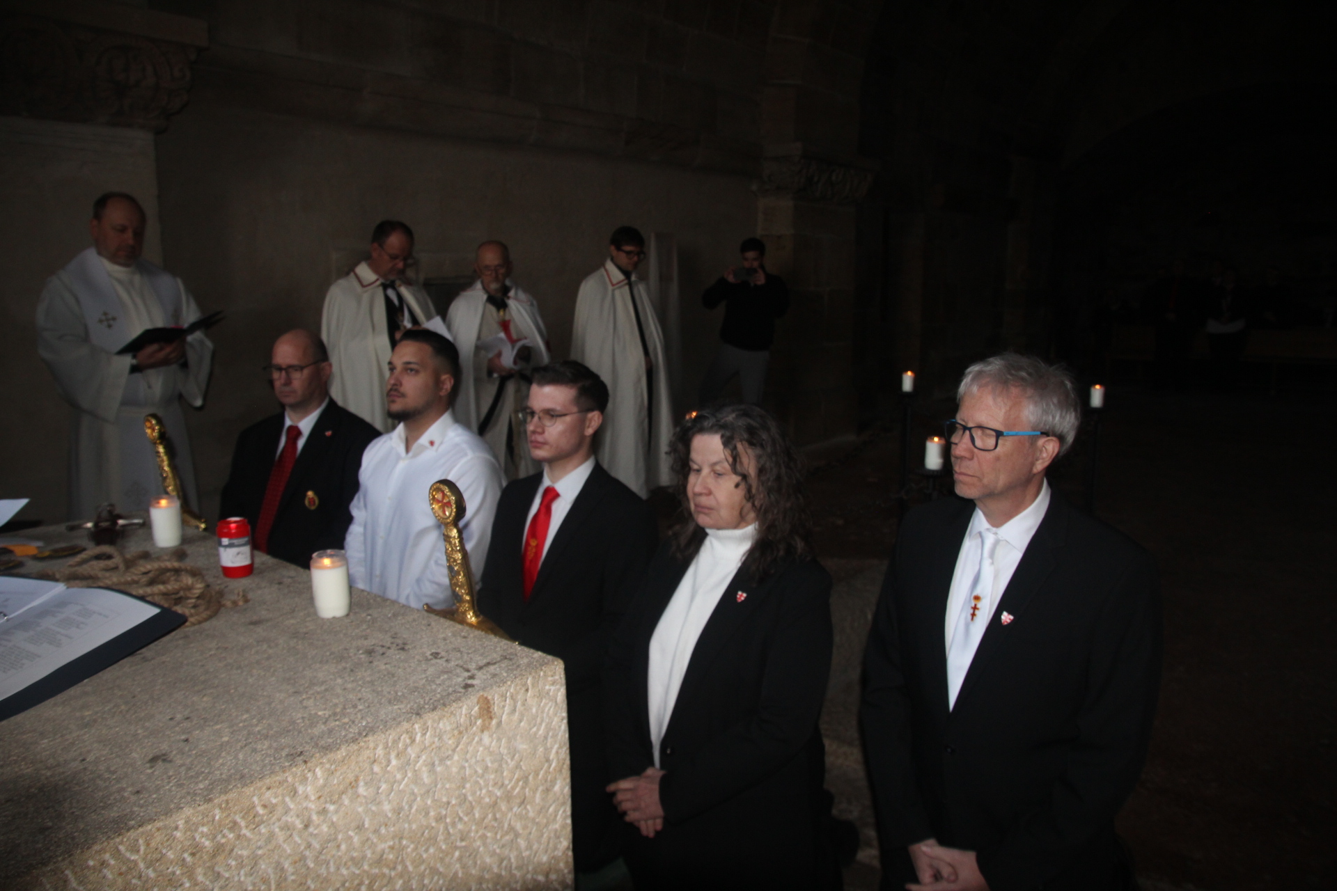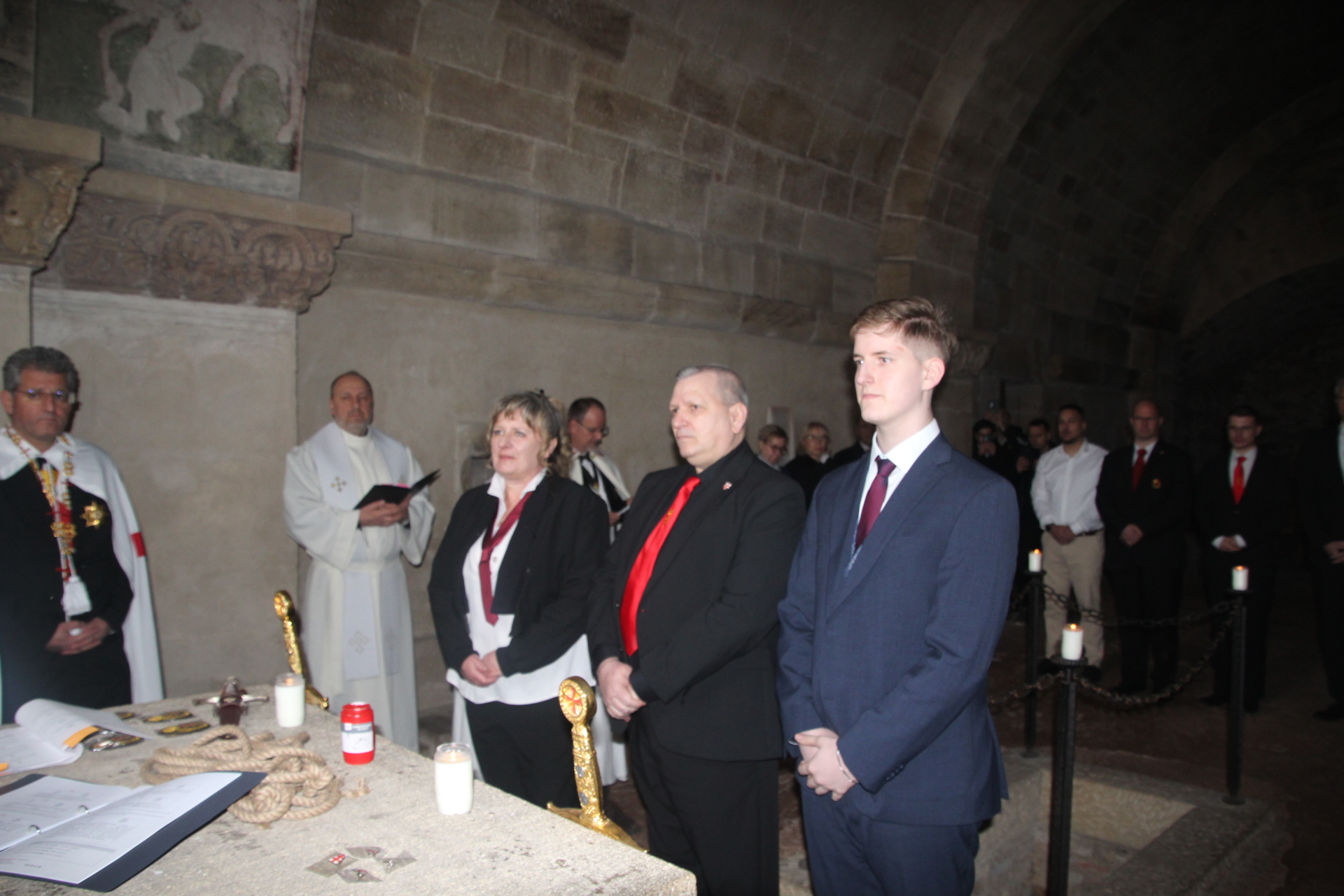 Die Ordensbrüder Steven Naschold, Wolfgang Wimmer (beide als Komture), Siegfried Schmelz (Zeremoniar), Alexander Bruder (Redner) und Romualdas Liachavicius (Kaplan) führten durch das Ritual und den Gottesdienst. Speziell zur Aufnahme als Postulanten bzw. zur Knappenweihe begaben sich alle Teilnehmer in die Krypta der Klosterkirche – dies war sicherlich einer der bewegendsten Momente für alle Kandidaten und Anwesenden. Diese Nachbildung der Gnadenkapelle im Heiligen Land und Teil des Pilgerweges vermittelte die richtige Atmosphäre und Spiritualität für dieses ehrwürdige Ritual und den Anlass.